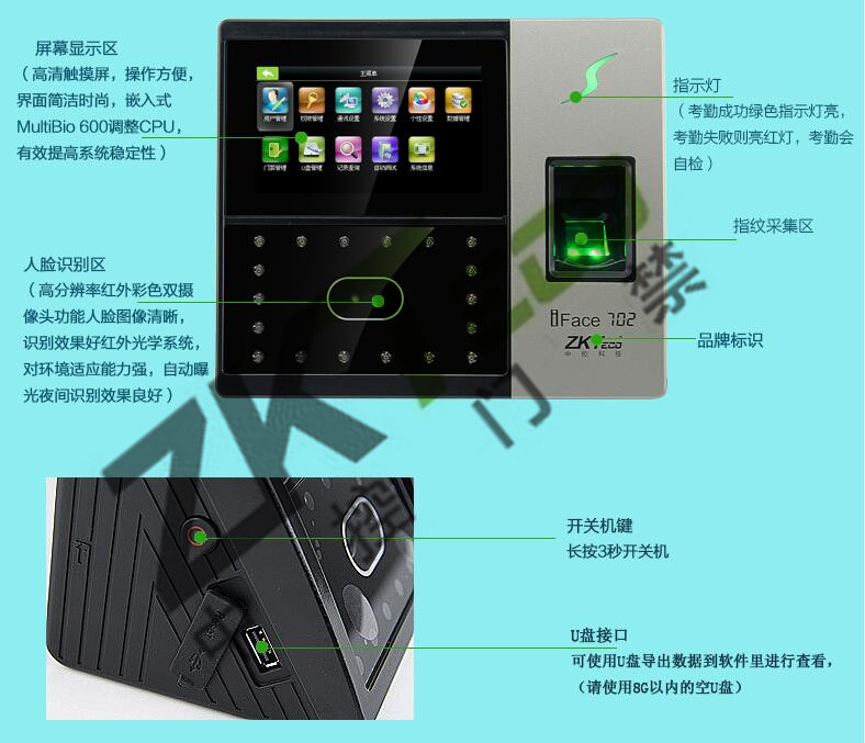 中控面部識別門禁iface702 指紋考勤打卡機